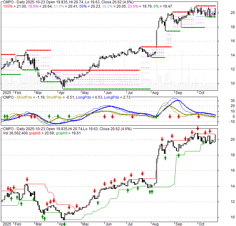Price has closed above its short-term moving average. Short-term moving average is currently above mid-term; and above long-term moving average. From the relationship between price and moving averages: This stock is BULLISH in short-term; and BULLISH in mid-long term.[ CMPO ] has closed below upper band by 10.8%. Bollinger Bands are 35.6% narrower than normal. The current width of the bands does not suggest anything about the future direction or movement of prices.