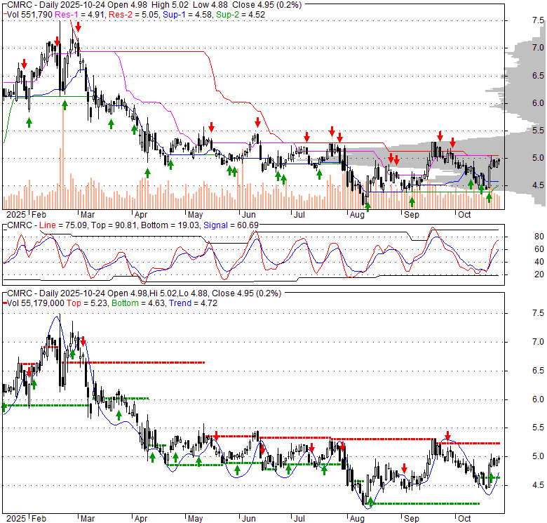 Price has closed above its short-term moving average. Short-term moving average is currently above mid-term; and above long-term moving average. From the relationship between price and moving averages: This stock is BULLISH in short-term; and NEUTRAL in mid-long term.[ CMRC ] has closed below upper band by 19.0%. Bollinger Bands are 4.8% narrower than normal. The current width of the bands does not suggest anything about the future direction or movement of prices.