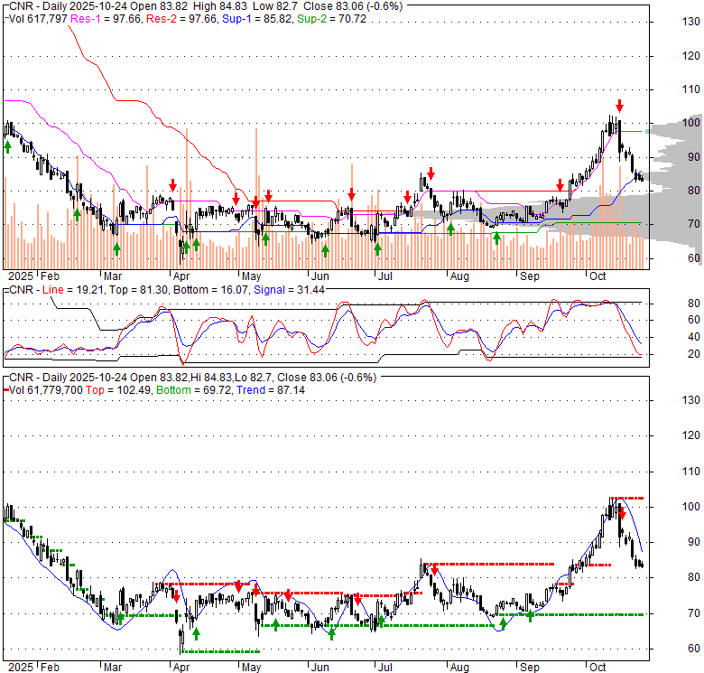 Price has closed below its short-term moving average. Short-term moving average is currently above mid-term; and above long-term moving average. From the relationship between price and moving averages: This stock is NEUTRAL in short-term; and BULLISH in mid-long term.[ CNR ] has closed above bottom band by 12.6%. Bollinger Bands are 82.6% wider than normal. The large width of the bands suggest high volatility as compared to its normal range. The bands have been in this wide range for 20 days. This is a sign that the current trend might continue.