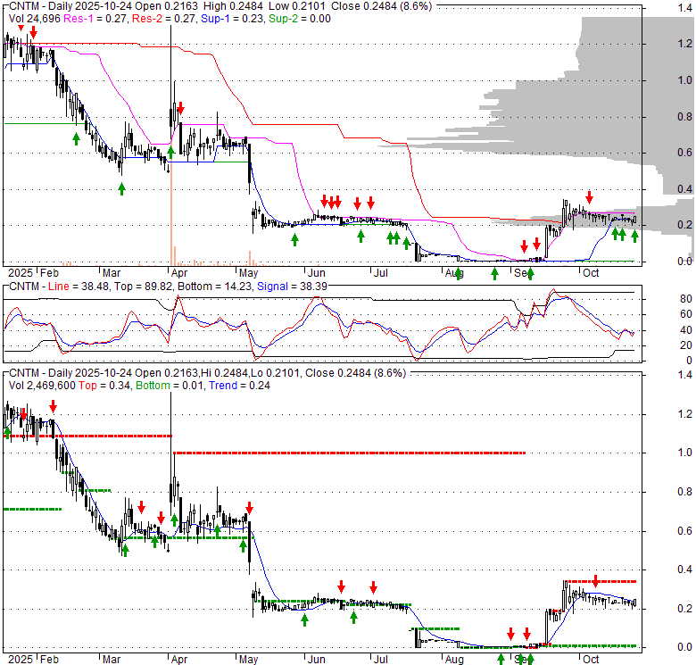 Price has closed below its short-term moving average. Short-term moving average is currently above mid-term; and above long-term moving average. From the relationship between price and moving averages: This stock is NEUTRAL in short-term; and BULLISH in mid-long term.[ CNTM ] has closed below the lower bollinger band by 6.2%. Although price has broken the lower band and a downside breakout is possible; the most likely direction for [ CNTM ] is to continue within current trading range. It is unclear right now based on current values. 55.4% narrower than normal. The narrow width of the bands suggests low volatility as compared to its normal range. The bands have been in this narrow range for 6 bars. This is a sign that the market may be about to initiate a new trend.