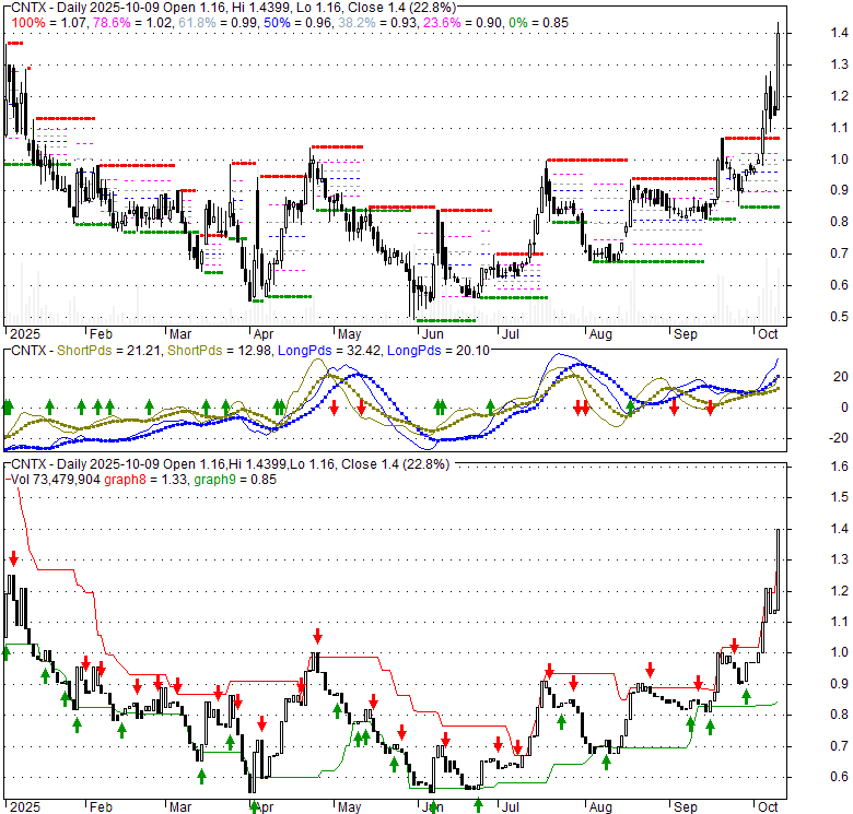 Price has closed above its short-term moving average. Short-term moving average is currently above mid-term; and above long-term moving average. From the relationship between price and moving averages: This stock is BULLISH in short-term; and BULLISH in mid-long term.[ CNTX ] has closed above the upper band by 16.1%. If price is in a uptrend band; this upward trend in price might continue. However a short term pullback inside the band is likely.Bollinger Bands are 108.3% wider than normal. The large width of the bands suggest high volatility as compared to its normal range. The bands have been in this wide range for 3 days. This is a sign that the current trend might continue.