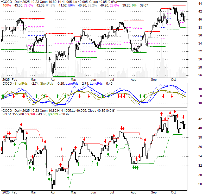Price has closed above its short-term moving average. Short-term moving average is currently above mid-term; and above long-term moving average. From the relationship between price and moving averages: This stock is BULLISH in short-term; and BULLISH in mid-long term.[ COCO ] has closed above bottom band by 42.0%. Bollinger Bands are 10.5% narrower than normal. The current width of the bands does not suggest anything about the future direction or movement of prices.