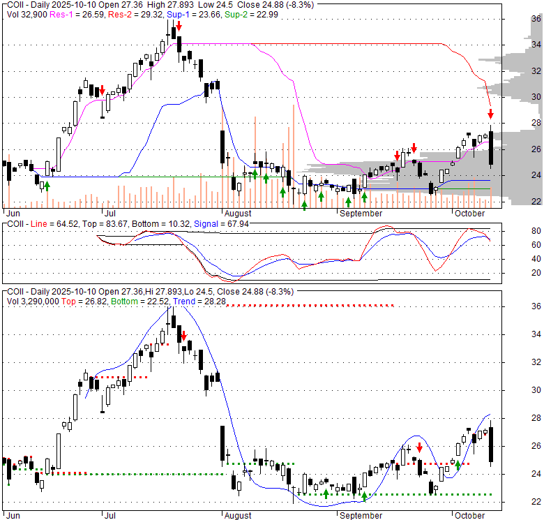 Price has closed below its short-term moving average. Short-term moving average is currently above mid-term; and below long-term moving average. From the relationship between price and moving averages: This stock is NEUTRAL in short-term; and NEUTRAL in mid-long term.[ COII ] has closed above bottom band by 44.3%. Bollinger Bands are 0% narrower than normal.