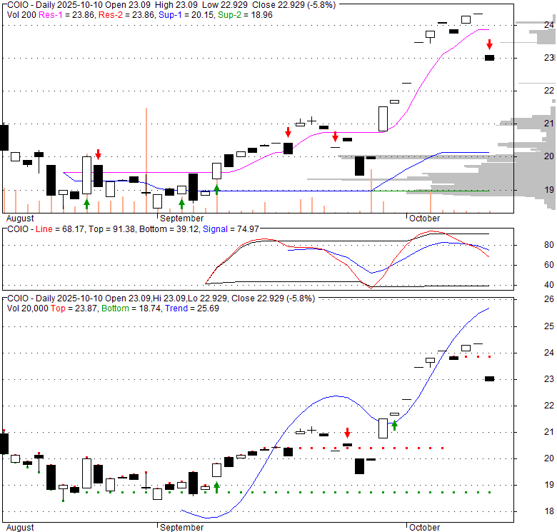 Price has closed below its short-term moving average. Short-term moving average is currently below mid-term; and below long-term moving average. From the relationship between price and moving averages: This stock is NEUTRAL in short-term; and NEUTRAL in mid-long term.[ COIO ] has closed below upper band by 39.2%. Bollinger Bands are 0% narrower than normal.