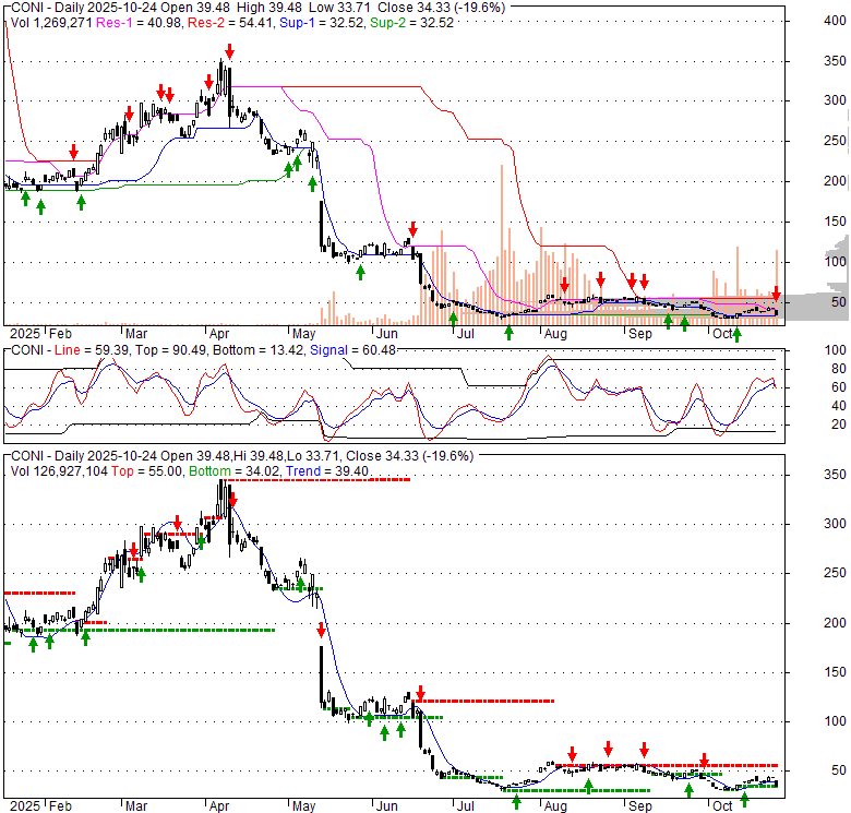 Price has closed below its short-term moving average. Short-term moving average is currently below mid-term; and below long-term moving average. From the relationship between price and moving averages: This stock is BEARISH in short-term; and BEARISH in mid-long term.[ CONI ] has closed above bottom band by 34.5%. Bollinger Bands are 45.8% narrower than normal. The narrow width of the bands suggests low volatility as compared to its normal range. The bands have been in this narrow range for 75 bars. This is a sign that the market may be about to initiate a new trend.