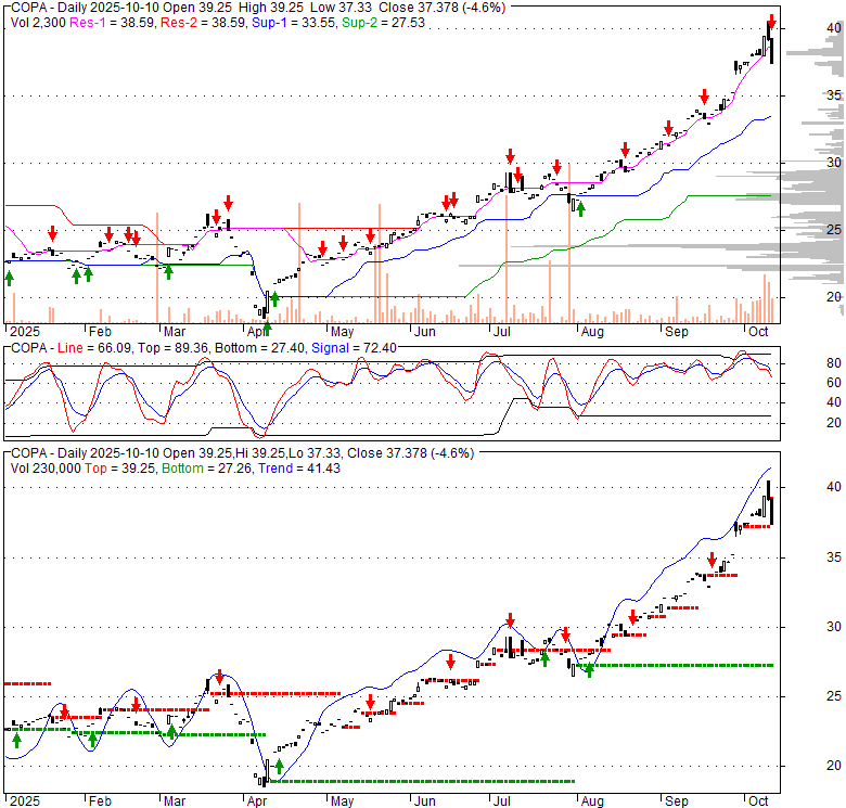 Price has closed below its short-term moving average. Short-term moving average is currently above mid-term; and above long-term moving average. From the relationship between price and moving averages: This stock is NEUTRAL in short-term; and BULLISH in mid-long term.[ COPA ] has closed below upper band by 41.4%. Bollinger Bands are 120.6% wider than normal. The large width of the bands suggest high volatility as compared to its normal range. The bands have been in this wide range for 9 days. This is a sign that the current trend might continue.