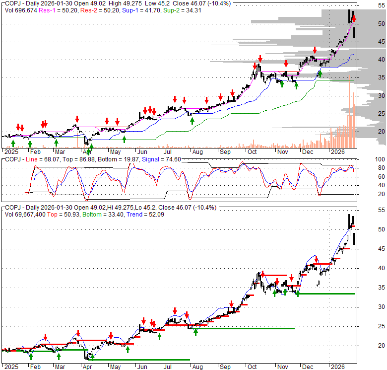 Price has closed below its short-term moving average. Short-term moving average is currently above mid-term; and above long-term moving average. From the relationship between price and moving averages: This stock is NEUTRAL in short-term; and BULLISH in mid-long term.[ COPJ ] has closed above bottom band by 43.3%. Bollinger Bands are 88.4% wider than normal. The large width of the bands suggest high volatility as compared to its normal range. The bands have been in this wide range for 16 days. This is a sign that the current trend might continue.