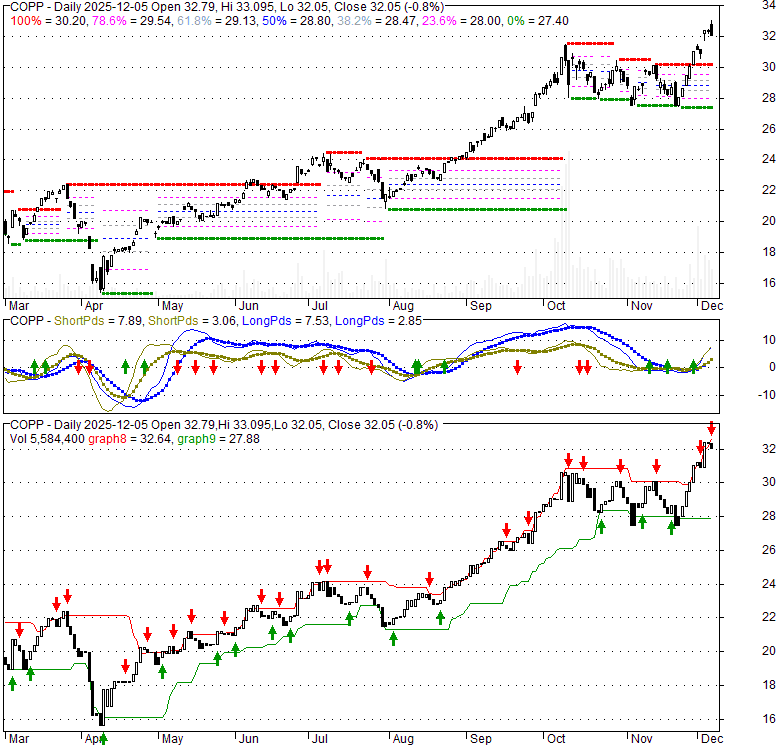 Price has closed above its short-term moving average. Short-term moving average is currently above mid-term; and above long-term moving average. From the relationship between price and moving averages: This stock is BULLISH in short-term; and BULLISH in mid-long term.[ COPP ] has closed below upper band by 16.0%. Bollinger Bands are 115.4% wider than normal. The large width of the bands suggest high volatility as compared to its normal range. The bands have been in this wide range for 4 days. This is a sign that the current trend might continue.