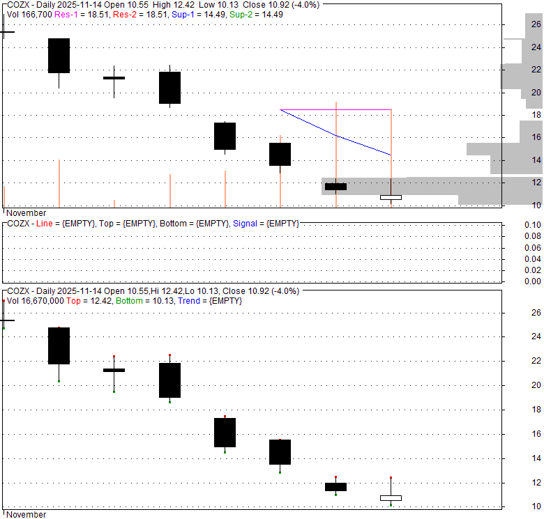 Price has closed below its short-term moving average. Short-term moving average is currently below mid-term; and below long-term moving average. From the relationship between price and moving averages: This stock is NEUTRAL in short-term; and NEUTRAL in mid-long term.[ COZX ] has closed Bollinger Bands are 0% narrower than normal.