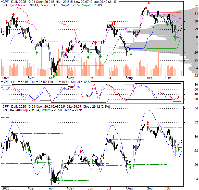 Price has closed above its short-term moving average. Short-term moving average is currently below mid-term; and above long-term moving average. From the relationship between price and moving averages: This stock is NEUTRAL in short-term; and NEUTRAL in mid-long term.[ CPF ] has closed below upper band by 40.5%. Bollinger Bands are 3.2% wider than normal. The current width of the bands does not suggest anything about the future direction or movement of prices.