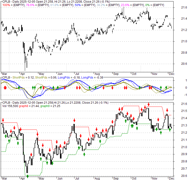 Price has closed below its short-term moving average. Short-term moving average is currently below mid-term; and below long-term moving average. From the relationship between price and moving averages: This stock is BEARISH in short-term; and NEUTRAL in mid-long term.[ CPLB ] has closed above bottom band by 30.2%. Bollinger Bands are 15.2% wider than normal. The current width of the bands does not suggest anything about the future direction or movement of prices.