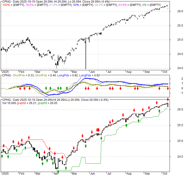 Price has closed below its short-term moving average. Short-term moving average is currently above mid-term; and above long-term moving average. From the relationship between price and moving averages: This stock is NEUTRAL in short-term; and BULLISH in mid-long term.[ CPNQ ] has closed above bottom band by 26.1%. Bollinger Bands are 37.9% narrower than normal. The current width of the bands does not suggest anything about the future direction or movement of prices.
