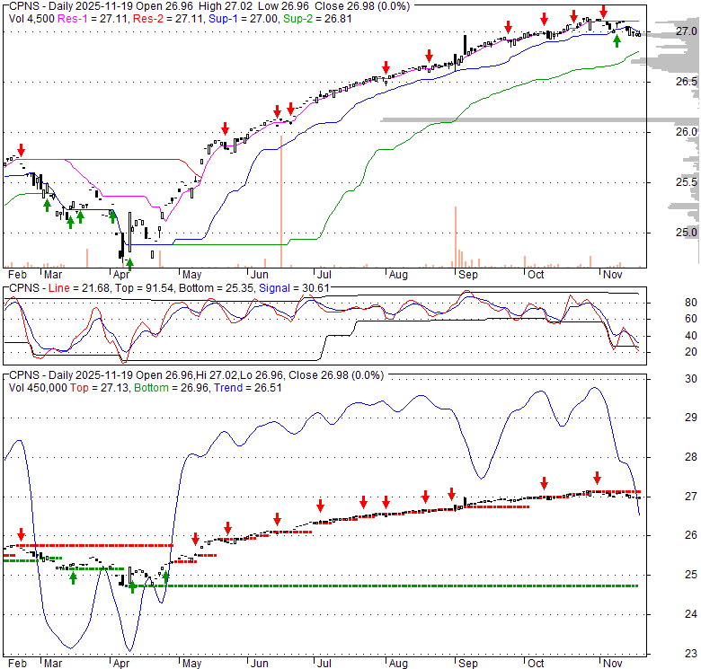 Price has closed below its short-term moving average. Short-term moving average is currently below mid-term; and above long-term moving average. From the relationship between price and moving averages: This stock is BEARISH in short-term; and NEUTRAL in mid-long term.[ CPNS ] has closed above bottom band by 9.0%. Bollinger Bands are 8.6% wider than normal. The current width of the bands does not suggest anything about the future direction or movement of prices.