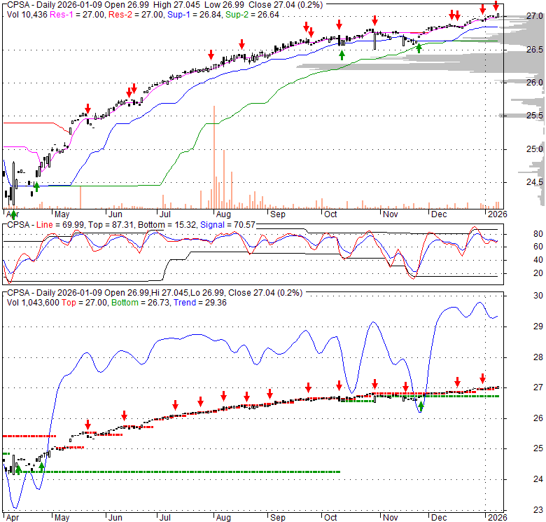 Price has closed above its short-term moving average. Short-term moving average is currently above mid-term; and above long-term moving average. From the relationship between price and moving averages: This stock is BULLISH in short-term; and BULLISH in mid-long term.[ CPSA ] has closed below upper band by 6.3%. Bollinger Bands are 0.1% narrower than normal. The current width of the bands does not suggest anything about the future direction or movement of prices.