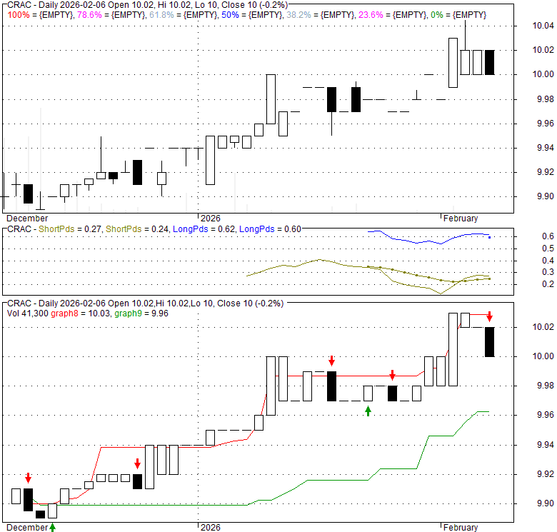 Price has closed below its short-term moving average. Short-term moving average is currently below mid-term; and below long-term moving average. From the relationship between price and moving averages: This stock is NEUTRAL in short-term; and NEUTRAL in mid-long term.[ CRAC ] has closed below upper band by 35.8%. Bollinger Bands are 0% narrower than normal.