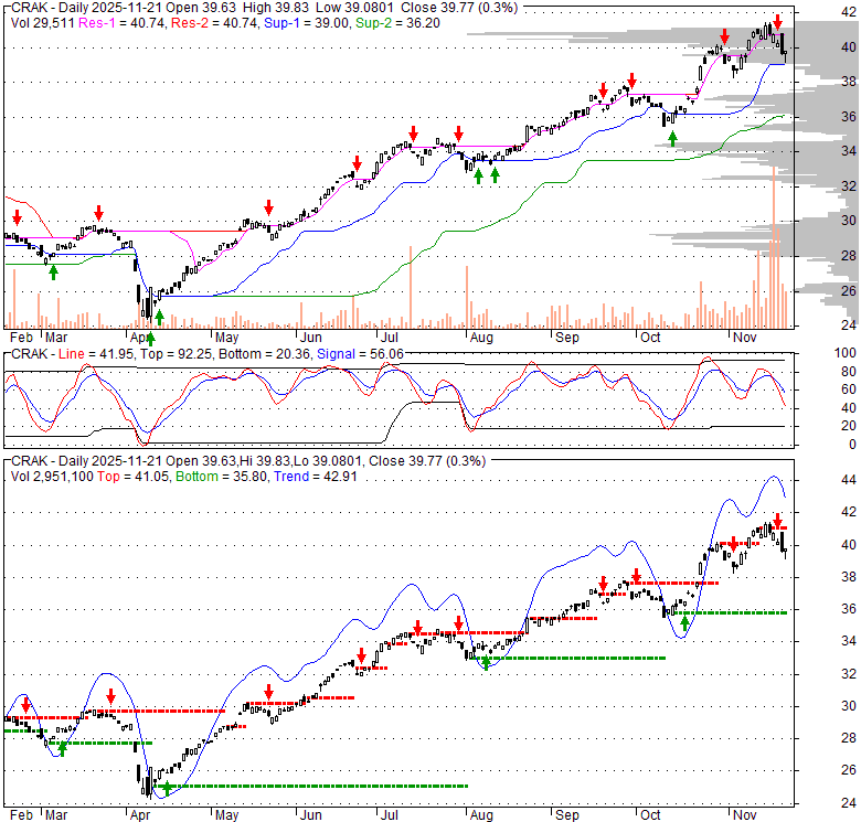 Price has closed below its short-term moving average. Short-term moving average is currently above mid-term; and above long-term moving average. From the relationship between price and moving averages: This stock is NEUTRAL in short-term; and BULLISH in mid-long term.[ CRAK ] has closed above bottom band by 40.6%. Bollinger Bands are 24.3% wider than normal. The current width of the bands does not suggest anything about the future direction or movement of prices.