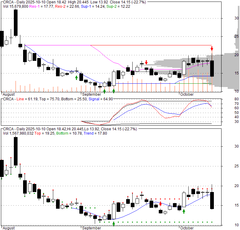 Price has closed below its short-term moving average. Short-term moving average is currently above mid-term; and below long-term moving average. From the relationship between price and moving averages: This stock is NEUTRAL in short-term; and NEUTRAL in mid-long term.[ CRCA ] has closed above bottom band by 28.5%. Bollinger Bands are 0% narrower than normal.