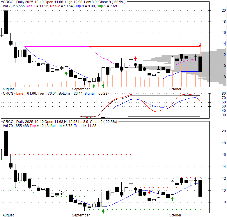 Price has closed below its short-term moving average. Short-term moving average is currently below mid-term; and below long-term moving average. From the relationship between price and moving averages: This stock is NEUTRAL in short-term; and NEUTRAL in mid-long term.[ CRCG ] has closed above bottom band by 29.3%. Bollinger Bands are 0% narrower than normal.