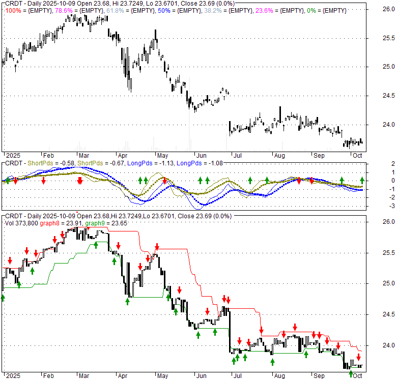Price has closed above its short-term moving average. Short-term moving average is currently below mid-term; and below long-term moving average. From the relationship between price and moving averages: This stock is NEUTRAL in short-term; and BEARISH in mid-long term.[ CRDT ] has closed above bottom band by 41.5%. Bollinger Bands are 28.7% narrower than normal. The current width of the bands does not suggest anything about the future direction or movement of prices.