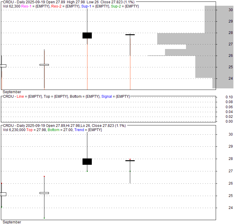 Price has closed below its short-term moving average. Short-term moving average is currently below mid-term; and below long-term moving average. From the relationship between price and moving averages: This stock is NEUTRAL in short-term; and NEUTRAL in mid-long term.[ CRDU ] has closed Bollinger Bands are 0% narrower than normal.