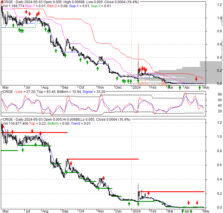 Price has closed below its short-term moving average. Short-term moving average is currently below mid-term; and below long-term moving average. From the relationship between price and moving averages: This stock is BEARISH in short-term; and BEARISH in mid-long term.[ CRGE ] has closed above bottom band by 18.9%. Bollinger Bands are 88.5% narrower than normal. The narrow width of the bands suggests low volatility as compared to its normal range. The bands have been in this narrow range for 35 bars. This is a sign that the market may be about to initiate a new trend.