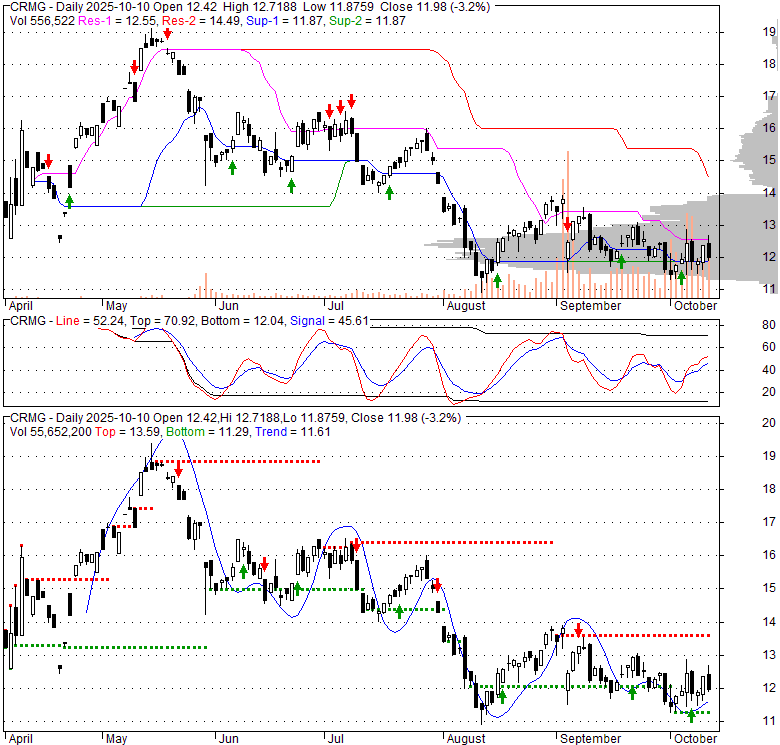 Price has closed below its short-term moving average. Short-term moving average is currently below mid-term; and below long-term moving average. From the relationship between price and moving averages: This stock is BEARISH in short-term; and BEARISH in mid-long term.[ CRMG ] has closed above bottom band by 40.5%. Bollinger Bands are 44.6% narrower than normal. The narrow width of the bands suggests low volatility as compared to its normal range. The bands have been in this narrow range for 12 bars. This is a sign that the market may be about to initiate a new trend.