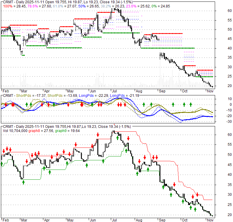Price has closed below its short-term moving average. Short-term moving average is currently below mid-term; and below long-term moving average. From the relationship between price and moving averages: This stock is BEARISH in short-term; and BEARISH in mid-long term.[ CRMT ] has closed above bottom band by 14.3%. Bollinger Bands are 20.8% narrower than normal. The current width of the bands does not suggest anything about the future direction or movement of prices.