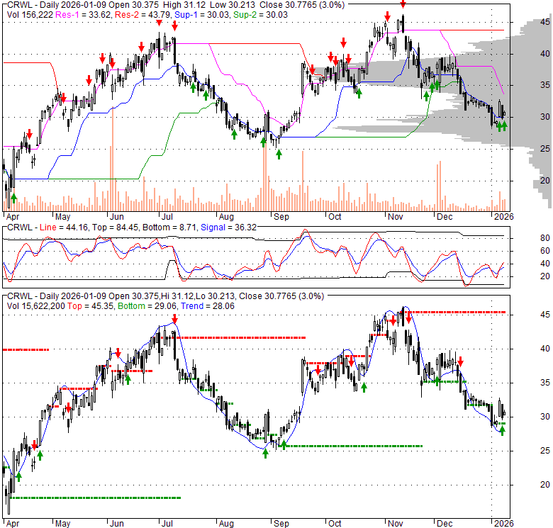 Price has closed below its short-term moving average. Short-term moving average is currently below mid-term; and below long-term moving average. From the relationship between price and moving averages: This stock is BEARISH in short-term; and NEUTRAL in mid-long term.[ CRWL ] has closed above bottom band by 23.5%. Bollinger Bands are 33.7% narrower than normal. The current width of the bands does not suggest anything about the future direction or movement of prices.