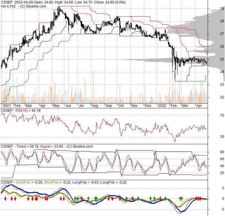 Price has closed above its short-term moving average. Short-term moving average is currently below mid-term; and below long-term moving average. From the relationship between price and moving averages: This stock is NEUTRAL in short-term; and BEARISH in mid-long term.[ CSSEP ] has closed above bottom band by 30.9%. Bollinger Bands are 52.3% narrower than normal. The narrow width of the bands suggests low volatility as compared to its normal range. The bands have been in this narrow range for 25 bars. This is a sign that the market may be about to initiate a new trend.