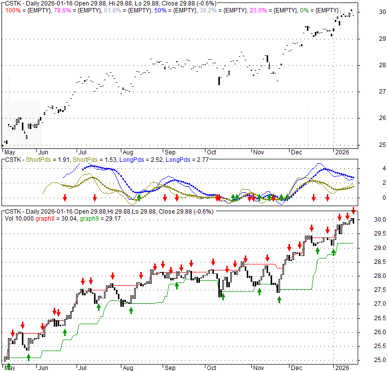Price has closed below its short-term moving average. Short-term moving average is currently above mid-term; and above long-term moving average. From the relationship between price and moving averages: This stock is NEUTRAL in short-term; and BULLISH in mid-long term.[ CSTK ] has closed below upper band by 30.6%. Bollinger Bands are 23.5% wider than normal. The current width of the bands does not suggest anything about the future direction or movement of prices.