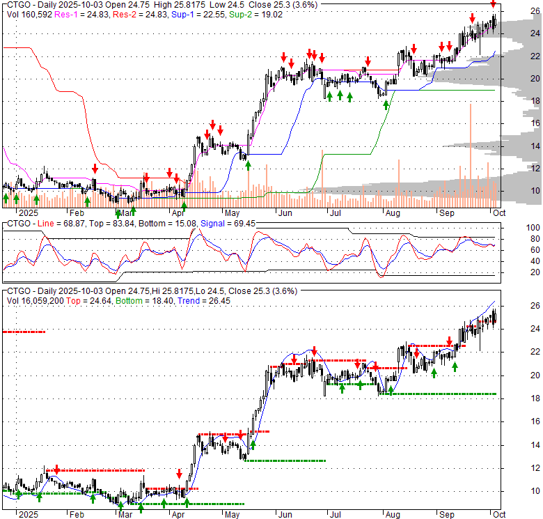 Price has closed above its short-term moving average. Short-term moving average is currently above mid-term; and above long-term moving average. From the relationship between price and moving averages: This stock is BULLISH in short-term; and BULLISH in mid-long term.[ CTGO ] has closed below upper band by 5.9%. Bollinger Bands are 31.9% narrower than normal. The current width of the bands does not suggest anything about the future direction or movement of prices.