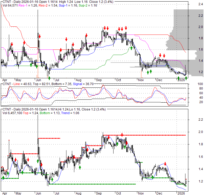 Price has closed above its short-term moving average. Short-term moving average is currently below mid-term; and below long-term moving average. From the relationship between price and moving averages: This stock is NEUTRAL in short-term; and BEARISH in mid-long term.[ CTNT ] has closed below upper band by 40.4%. Bollinger Bands are 60.4% narrower than normal. The narrow width of the bands suggests low volatility as compared to its normal range. The bands have been in this narrow range for 5 bars. This is a sign that the market may be about to initiate a new trend.
