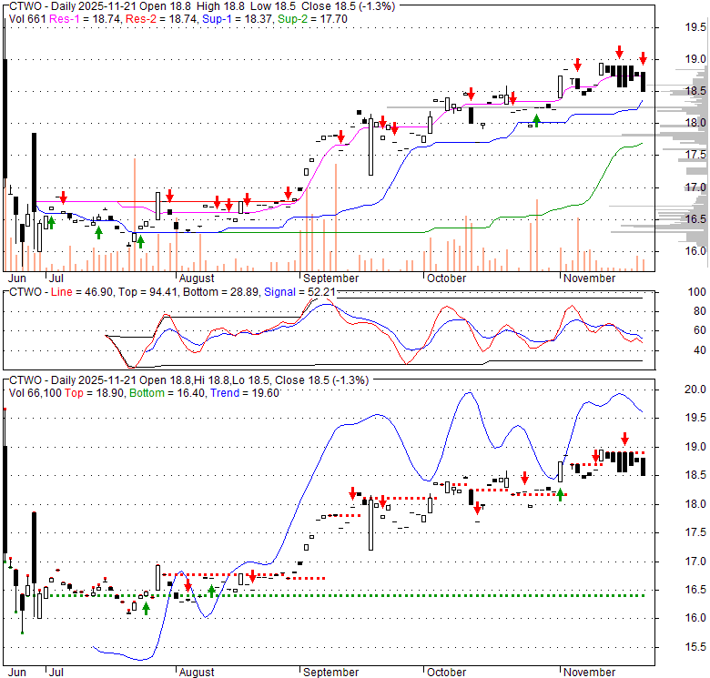 Price has closed below its short-term moving average. Short-term moving average is currently above mid-term; and above long-term moving average. From the relationship between price and moving averages: This stock is NEUTRAL in short-term; and BULLISH in mid-long term.[ CTWO ] has closed above bottom band by 20.4%. Bollinger Bands are 0% narrower than normal.