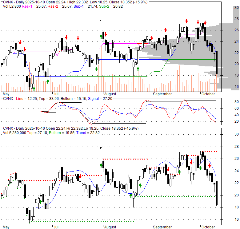 Price has closed below its short-term moving average. Short-term moving average is currently below mid-term; and below long-term moving average. From the relationship between price and moving averages: This stock is BEARISH in short-term; and NEUTRAL in mid-long term.[ CVNX ] has closed below the lower bollinger band by 16.6%. If price is in a downtrend band; this downward trend might continue. However a short term pullback inside the band is likely. Bollinger Bands are 0% narrower than normal.
