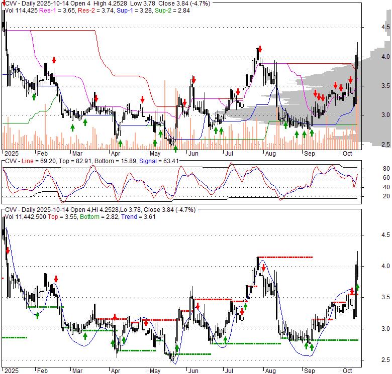 Price has closed above its short-term moving average. Short-term moving average is currently above mid-term; and above long-term moving average. From the relationship between price and moving averages: This stock is BULLISH in short-term; and NEUTRAL in mid-long term.[ CVV ] has closed below upper band by 2.1%. Bollinger Bands are 9% wider than normal. The current width of the bands does not suggest anything about the future direction or movement of prices.