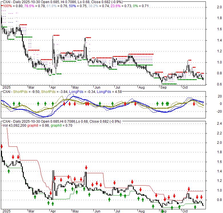 Price has closed below its short-term moving average. Short-term moving average is currently below mid-term; and below long-term moving average. From the relationship between price and moving averages: This stock is BEARISH in short-term; and BEARISH in mid-long term.[ CXAI ] has closed above bottom band by 10.6%. Bollinger Bands are 5.7% narrower than normal. The current width of the bands does not suggest anything about the future direction or movement of prices.