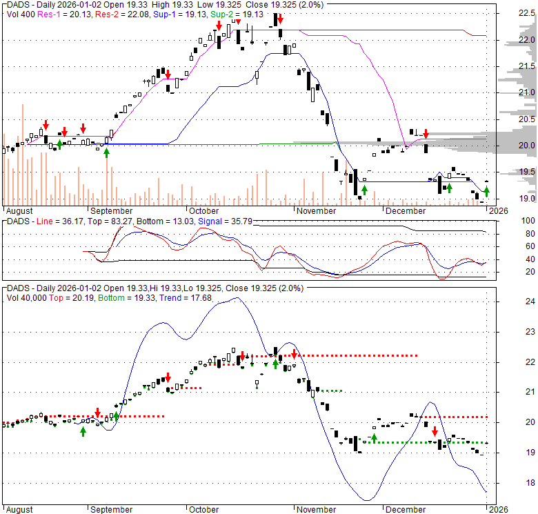Price has closed above its short-term moving average. Short-term moving average is currently below mid-term; and below long-term moving average. From the relationship between price and moving averages: This stock is NEUTRAL in short-term; and BEARISH in mid-long term.[ DADS ] has closed above bottom band by 45.6%. Bollinger Bands are 0% narrower than normal.