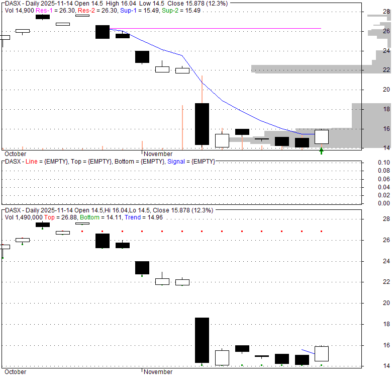 Price has closed above its short-term moving average. Short-term moving average is currently below mid-term; and below long-term moving average. From the relationship between price and moving averages: This stock is NEUTRAL in short-term; and NEUTRAL in mid-long term.[ DASX ] has closed above bottom band by 29.1%. Bollinger Bands are 0% narrower than normal.