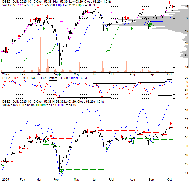 Price has closed below its short-term moving average. Short-term moving average is currently above mid-term; and above long-term moving average. From the relationship between price and moving averages: This stock is NEUTRAL in short-term; and BULLISH in mid-long term.[ DBEZ ] has closed above bottom band by 47.5%. Bollinger Bands are 22.6% wider than normal. The current width of the bands does not suggest anything about the future direction or movement of prices.