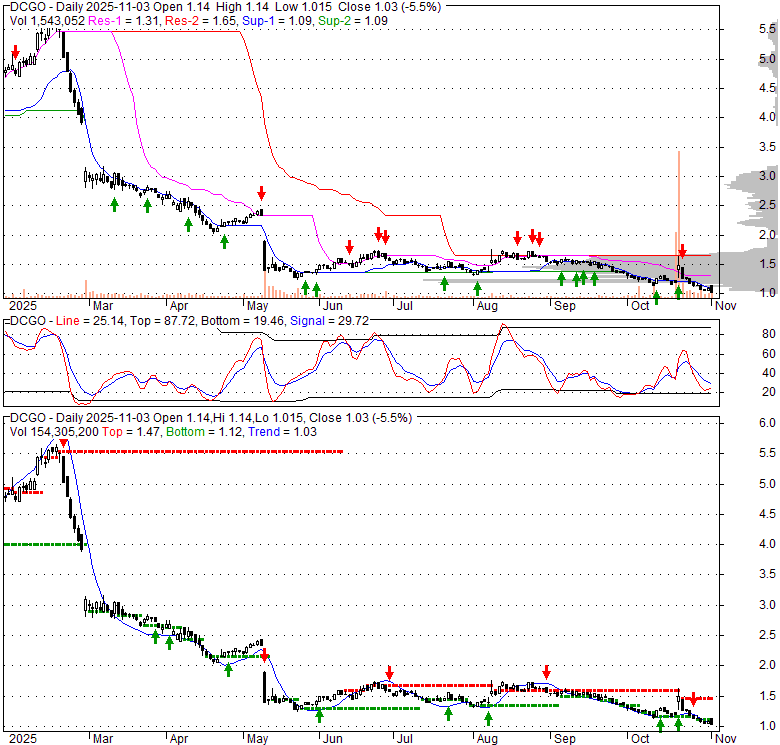 Price has closed below its short-term moving average. Short-term moving average is currently below mid-term; and below long-term moving average. From the relationship between price and moving averages: This stock is BEARISH in short-term; and BEARISH in mid-long term.[ DCGO ] has closed above bottom band by 17.1%. Bollinger Bands are 55.6% wider than normal. The large width of the bands suggest high volatility as compared to its normal range. The bands have been in this wide range for 2 days. This is a sign that the current trend might continue.