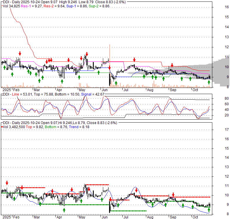 Price has closed above its short-term moving average. Short-term moving average is currently below mid-term; and below long-term moving average. From the relationship between price and moving averages: This stock is NEUTRAL in short-term; and BEARISH in mid-long term.[ DDI ] has closed below upper band by 43.0%. Bollinger Bands are 50.7% narrower than normal. The narrow width of the bands suggests low volatility as compared to its normal range. The bands have been in this narrow range for 1 bars. This is a sign that the market may be about to initiate a new trend.