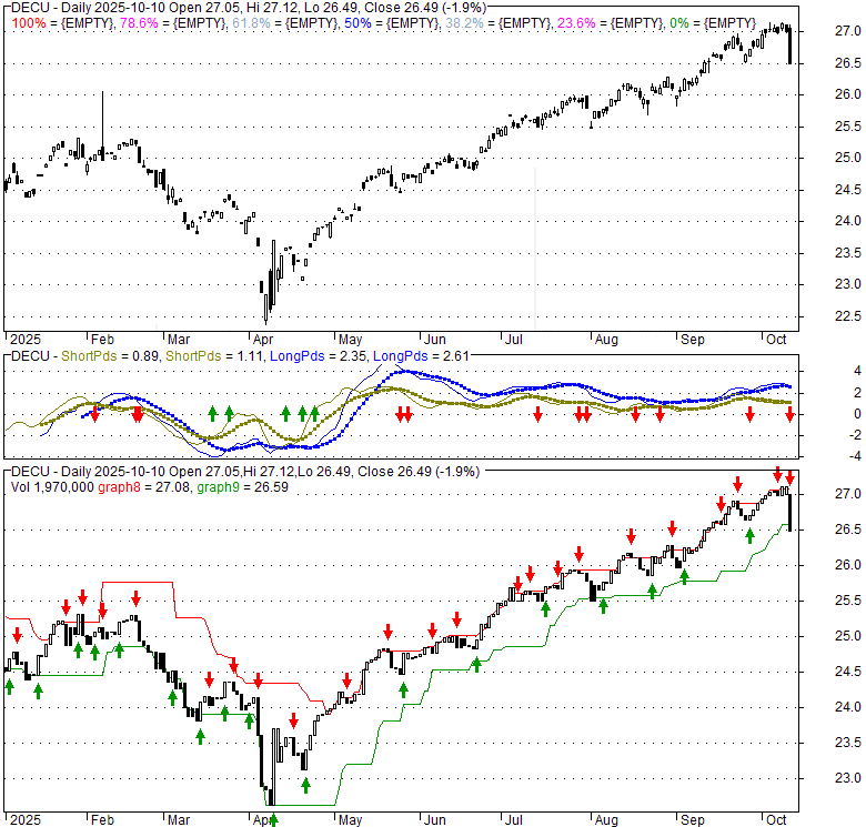 Price has closed below its short-term moving average. Short-term moving average is currently above mid-term; and above long-term moving average. From the relationship between price and moving averages: This stock is NEUTRAL in short-term; and BULLISH in mid-long term.[ DECU ] has closed below the lower bollinger band by 5.8%. Bollinger Bands are 5.2% wider than normal. The current width of the bands does not suggest anything about the future direction or movement of prices.