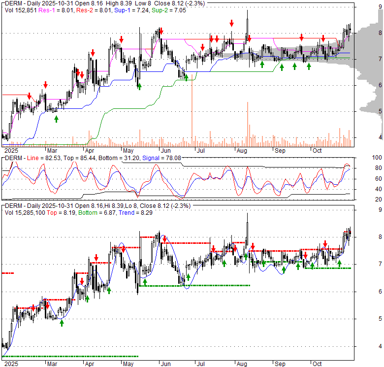 Price has closed above its short-term moving average. Short-term moving average is currently above mid-term; and above long-term moving average. From the relationship between price and moving averages: This stock is BULLISH in short-term; and BULLISH in mid-long term.[ DERM ] has closed below upper band by 16.0%. Bollinger Bands are 57.7% wider than normal. The large width of the bands suggest high volatility as compared to its normal range. The bands have been in this wide range for 1 days. This is a sign that the current trend might continue.
