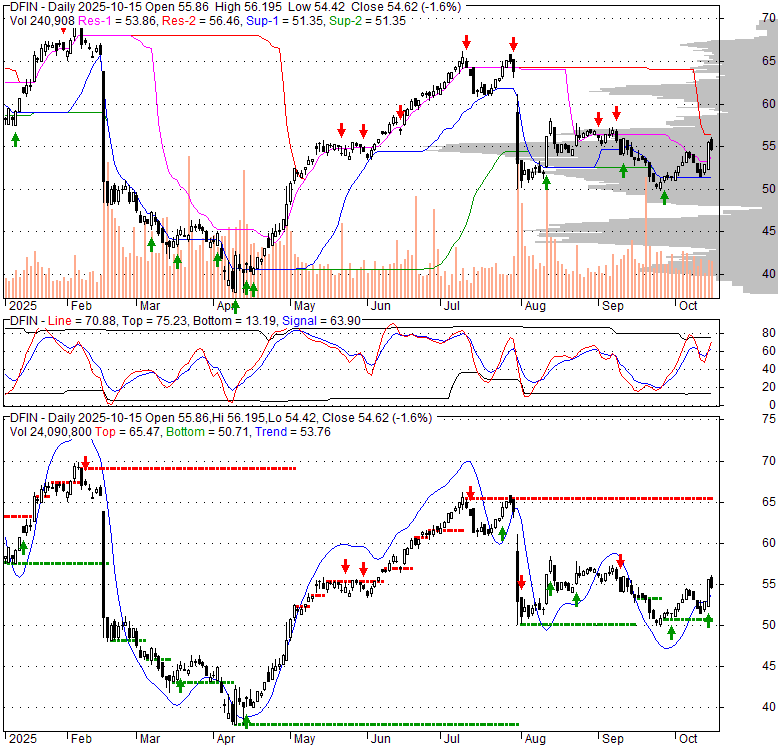 Price has closed above its short-term moving average. Short-term moving average is currently below mid-term; and below long-term moving average. From the relationship between price and moving averages: This stock is NEUTRAL in short-term; and BEARISH in mid-long term.[ DFIN ] has closed below upper band by 8.0%. Bollinger Bands are 25.9% narrower than normal. The current width of the bands does not suggest anything about the future direction or movement of prices.