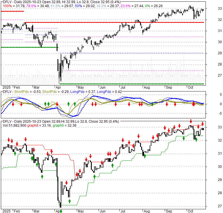 Price has closed above its short-term moving average. Short-term moving average is currently above mid-term; and above long-term moving average. From the relationship between price and moving averages: This stock is BULLISH in short-term; and BULLISH in mid-long term.[ DFLV ] has closed below upper band by 34.8%. Bollinger Bands are 7.5% wider than normal. The current width of the bands does not suggest anything about the future direction or movement of prices.