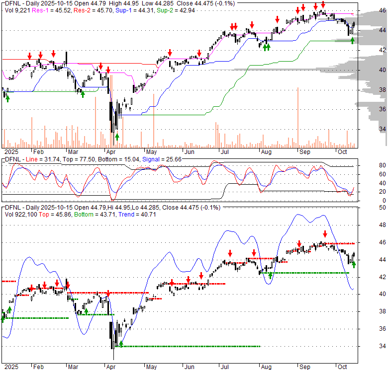 Price has closed above its short-term moving average. Short-term moving average is currently below mid-term; and above long-term moving average. From the relationship between price and moving averages: This stock is NEUTRAL in short-term; and NEUTRAL in mid-long term.[ DFNL ] has closed above bottom band by 42.0%. Bollinger Bands are 9.3% wider than normal. The current width of the bands does not suggest anything about the future direction or movement of prices.