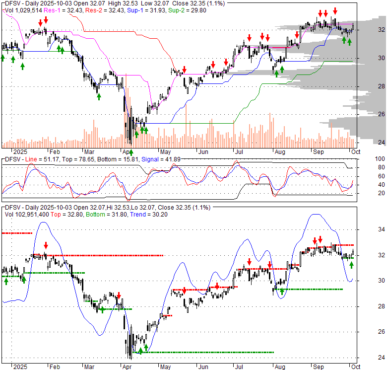 Price has closed above its short-term moving average. Short-term moving average is currently above mid-term; and above long-term moving average. From the relationship between price and moving averages: This stock is BULLISH in short-term; and BULLISH in mid-long term.[ DFSV ] has closed below upper band by 26.4%. Bollinger Bands are 54.6% narrower than normal. The narrow width of the bands suggests low volatility as compared to its normal range. The bands have been in this narrow range for 15 bars. This is a sign that the market may be about to initiate a new trend.