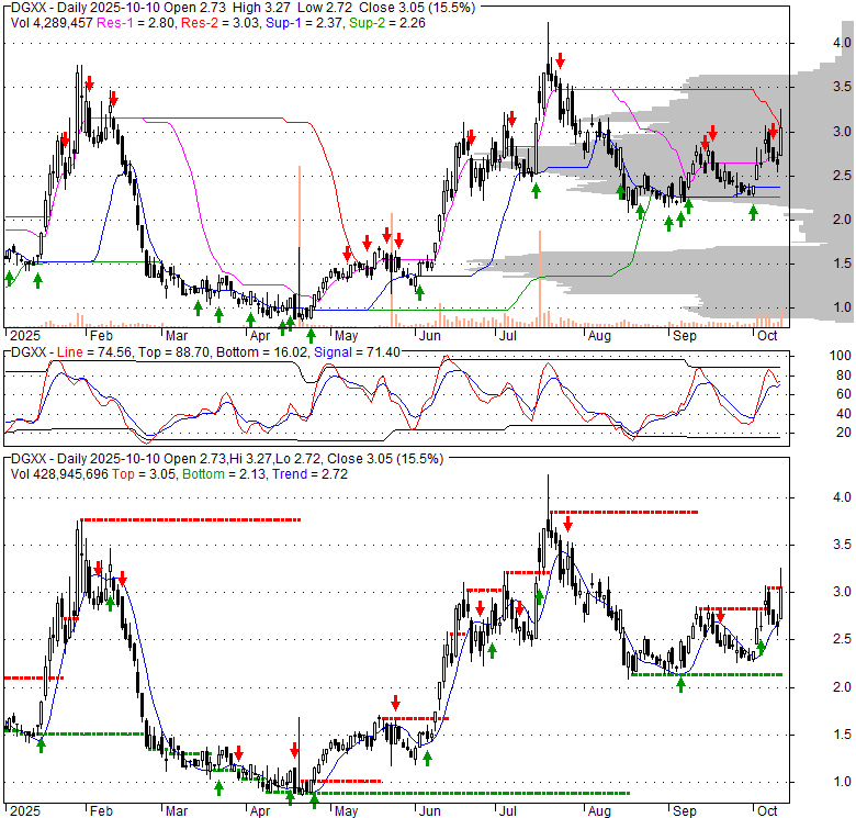 Price has closed above its short-term moving average. Short-term moving average is currently above mid-term; and above long-term moving average. From the relationship between price and moving averages: This stock is BULLISH in short-term; and BULLISH in mid-long term.[ DGXX ] has closed Bollinger Bands are 10.2% narrower than normal. The current width of the bands does not suggest anything about the future direction or movement of prices.