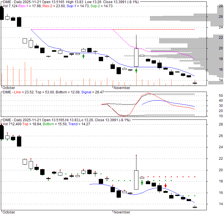 Price has closed below its short-term moving average. Short-term moving average is currently below mid-term; and below long-term moving average. From the relationship between price and moving averages: This stock is NEUTRAL in short-term; and NEUTRAL in mid-long term.[ DIME ] has closed above bottom band by 6.7%. Bollinger Bands are 0% narrower than normal.