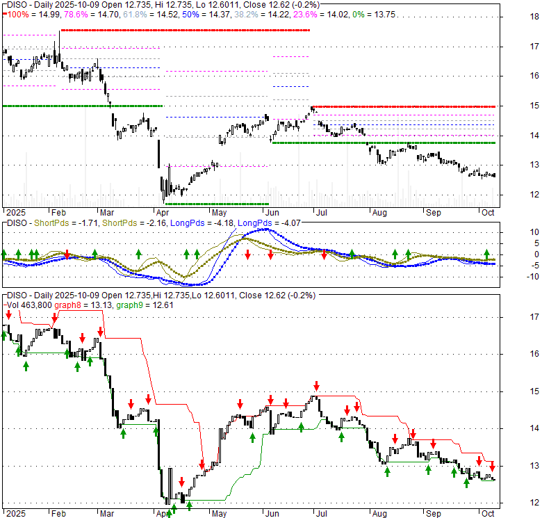 Price has closed below its short-term moving average. Short-term moving average is currently below mid-term; and below long-term moving average. From the relationship between price and moving averages: This stock is BEARISH in short-term; and BEARISH in mid-long term.[ DISO ] has closed above bottom band by 19.0%. Bollinger Bands are 52.4% narrower than normal. The narrow width of the bands suggests low volatility as compared to its normal range. The bands have been in this narrow range for 1 bars. This is a sign that the market may be about to initiate a new trend.